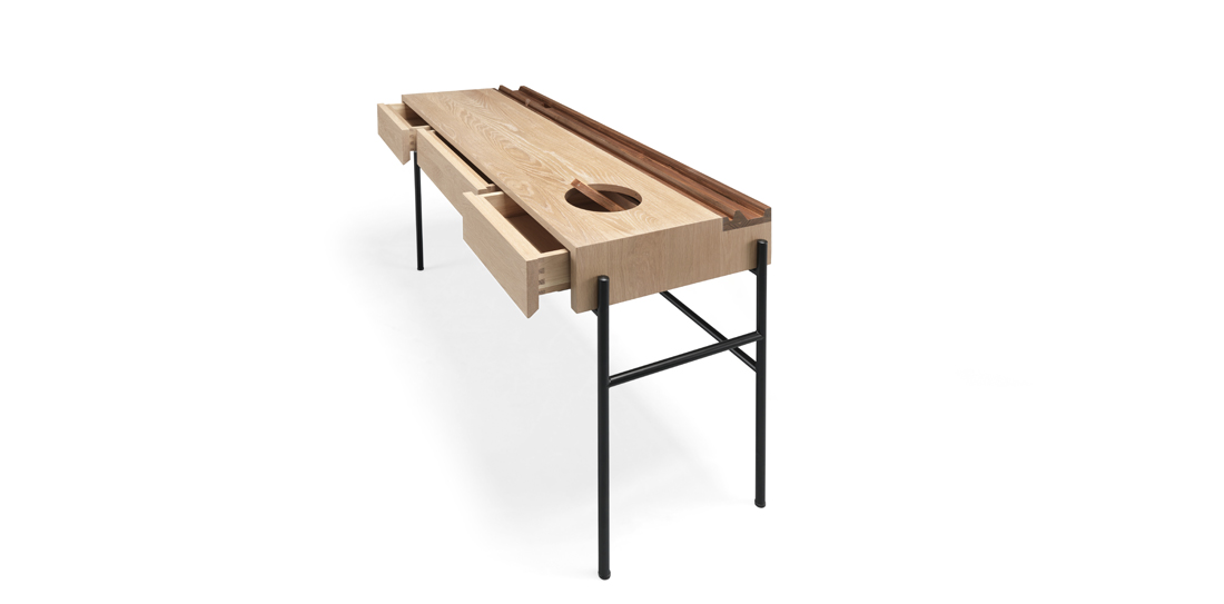 CONCIERGE IS HAND BUILT USING CLASSIC AND MODERN WOODWORKING TECHNIQUES, PROUDLY MADE IN PORTUGAL. ITS TOP FEATURES A PRACTICAL STORAGE WITH SEVERAL COMPARTMENTS SUCH AS THREE DRAWERS, ONE ROUND LID COMPARTMENT TO COLLECT THE ITEMS ON THE TOP AND ONE SHAPED STRIP IN SOLID WALNUT WITH SUPPORTING GROOVES TO DISPLAY BOOKS AND MAGAZINES.